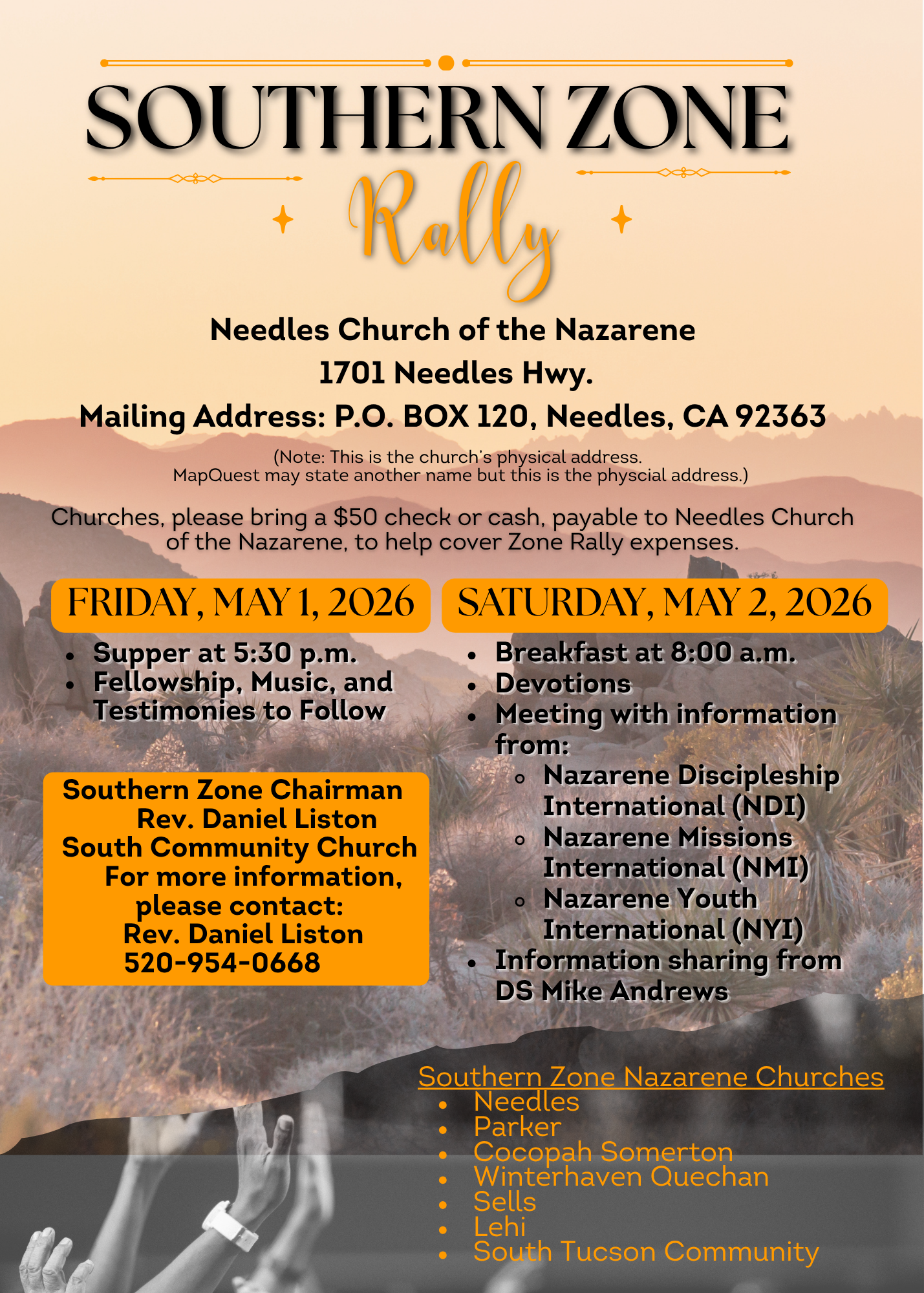 Southern Zone Rally Friday, May 1, 2026 5:30 PM Saturday, May 2, 2026 1:00 PM 1701 Needles Hwy Needles, CA 92363 (map) Google Calendar ICS